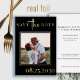 Trendy glam bold typography script real gold foil and black wedding save the date card template with custom photo and text.