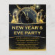 New year's eve party invitation flyer with an elegant clock, fireworks, drinks, and text in gold color, and a black background. Great for any business, corporate event, or club that wants to celebrate on December 31st. Personalize the text and year and add any extra message, social media, or logo by clicking the button to edit the design.