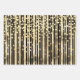 A trio of gift wrap, each with a different design on it but all in gold and black. The first sheet has alternating horizontal stripes in medium and thin lines across it; the second has a vertical thick stripe and horizontal / vertical thin stripes across it that form a cross square pattern and the third has thick and thin vertical lines across which are medium sized confetti polka dot circles. The background color may be changed to any of your choice.