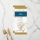 This design features an elegant yet simple arrangement of the bride's and groom's personalized initials in gold script. The blue accents compliment the gold creating a beautiful personalized script monogram design. This blue and gold design is modern yet retains its classic charm with the use of calligraphy script. The combination of colors creates a sophisticated, trendy and chic style. Elegant monogram wedding menu card design with modern elements. The simple setup of the typography gives it a distinct style. Matching wedding invitations and other stationery items are also available. To re-position the initials please click on "personalize this template" then click the bottom option "Want to customize this design even further? Edit using Design Tool"