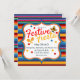 Multicolored serape (or sarape) in reds, gold, and blues decorates this party invitation. There are also maracas, confetti, and a sombrero with a mustache. Great for Cinco de Mayo or for any Mexican-themed event or birthday party.