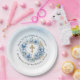 Modern, elegant Baptism paper plate. The plate features a blue and gold flowery wreath with gold cross on a watercolor dusty blue background. Personalize further with your thank you message.