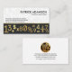 A white and dark grey layer is demarcated by a gold line that has a gold numbers-symbols motif near the base of the card.