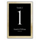 A gold border with a black background and white lettering wedding table number card that can be customized with any table number. The graphics appear on both sides of this card.