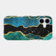 This pretty phone case features a dramatic abstract design in tones of blue, teal, gold and black. Tiny star confetti gives a sparkly effect, with your monogram in dark blue against lighter blue at the bottom left. Stunning!