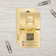 A faux gold looking background. Decorated with arch shapes and a golden bown. Personalize and add your business logo, photo, name, title and contact information. Add your website url/link to the Qr code. With Facebook and Instagram icons. Black text.