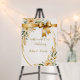 Stunning watercolor wedding sign featuring soft cream roses, eucalyptus greenery, and elegant gold foliage arranged in a beautiful frame design. Complete with a luxurious golden ribbon bow at the top, this versatile template is perfect for wedding welcome signs, ceremony programs, reception menus, or any special occasion signage. The warm neutral palette of cream, gold, and sage green creates a timeless, romantic aesthetic that complements any wedding style from rustic to elegant