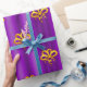 A colorful, festive pattern of gold bows scattered over a metallic purple to add a touch of elegance to your Christmas gifts this year.