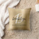 This personalized throw pillow features a monogram and first name in modern black and white script on a trendy gold brushed metal background, with the full name in sans serif font below.