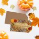 This customizable gift tag features a sophisticated diagonal plaid background in rich autumnal browns and tans. The design is anchored by a luminous, hand-painted gold-brushstroke banner that highlights the textured, rustic red greeting, "HAPPY THANKSGIVING." A vibrant border of fall foliage—deep-red maple, sunny-yellow, and green leaves—frames the central message, enhanced by subtle accents of star anise and berries. Easily personalize with your family name in a charming script beneath the greeting. This tag is the perfect way to add personal elegance to your Thanksgiving and Friendsgiving treats.