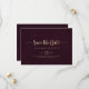 This gold burgundy calligraphy horizontal wedding save the date is perfect for a rustic wedding. The simple and elegant design features a gold classic and fancy script typography in a maroon background.
