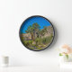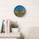 The size of the clock is dramatic and the abstract alcohol ink design is soothing and intricate at the same time. I chose the black frame that adds pop to the blue and gold design. The gold printing would be better in a slightly darker or larger font. I love it and I’m looking for just the right place in ny new apartment. I would recommend this clock for a personal gift or a present. I feel that the quality is excellent for the money! I’m a bit of a clock nut so I’m pretty particular about my purchases. The clock is larger in diameter than many if the clocks I have, so it stands out very well. I think a slightly darker printing color and a moderately larger size would best suit a professional decor or add more impact in a work place item.