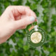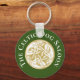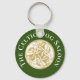 Keychain with customizable text and center intricate gold and white Celtic dogs in disc shaped design on green background.