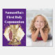 This design featuring a faux gold chapel chalice adorned with a pretty gold satin bow and a wooden cross has wooden rosary beads resting against it and a beautiful angel standing on its left. The chalice is framed by a white scallop banner set against a background color of your choice. This ideal for a first holy communion; baptism; christening or Catholic Church event.