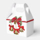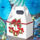 White gable style favor box with an image, on the front and back, of three gold Christmas bells with red bows on gold ribbons hanging from a red ribbon. The red ribbon is adorned with a gold-trimmed red bow with Christmas greenery, a gold-trimmed poinsettia and a pine cone. See the entire Holiday Favor Box collection in the PARTY FAVORS section.
