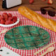 Gorgeous and chic faux metallic green background with faux gold damask pattern for a beautiful and elegant Christmas table setting. Perfect for your holiday table or holiday party.