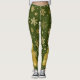 Christmas leggings with Gold Christmas Tree and Gold Snowflakes on green background.