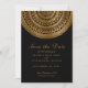 Customize this beautiful Vertical Save the Date Card featuring an original boho bohemian gold mandala on a black background. Please note that gold is a yellow color print and is not an actual gold foil.