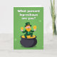 Designed with a rich emerald backdrop, this St. Patrick’s Day card features a cheerful cartoon leprechaun lounging in a wide black pot that’s overflowing with shiny gold coins 💚. He wears a green outfit with a buckled top hat, and his golden-orange beard frames a friendly face with wide eyes and a small, knowing smile. The leprechaun lifts two coins—one in each hand—as if showing them off to a close friend standing just outside the scene, turning the moment into a shared little joke. Behind him, the green background shifts in soft gradients and is dotted with faint, translucent shamrock shapes ☘️. Across the upper portion, the question “What percent leprechaun are you?” is set in large white lettering that stands out clearly against the darker greens. The pot and coins are layered for depth, and many coins include a small dollar sign that catches the light. The black pot sits centered near the bottom, with gold spilling up and around the leprechaun’s elbows in neat, rounded stacks.