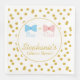 Gold confetti gender reveal paper napkins. The design features a confetti pattern and a white circle in the middle with a blue bow tie and a pink bow with your custom text.