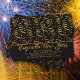Black and gold New Year’s Eve party invitation template. Confetti and streamers in gold colors fall across the top of this horizontal invitation. “Ring in the New Year” is the large text in modern, swirling font style. All party information is printed in four lines beneath the large text. The new year numbers make a pattern on the back of the card, so don’t forget to change it! Shown with upgraded rounded corners, which can easily be changed. Upgrade the paper type as preferred.
