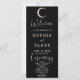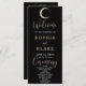 On the reverse side, the wedding party is tastefully listed, complemented by the captivating gold crescent moon, set against the elegant black canvas. This celestial theme adds an aura of mystique, making it an ideal choice for couples seeking celestial, moon-themed, or mystical wedding themes.