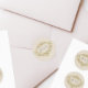 An elegant round envelope seal, this design features an ornate golden decoration set against a lightly flecked, beige background. The monogrammed initials can be customized to suit - or removed altogether if preferred.
