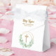 A gold faux glitter cross and eucalyptus leaf wreath highlight these ribbon closure tent style favor boxes with your text in chic lettering. Perfect for your child's first communion, christening or baptism. MATCHING items available in our collection.