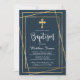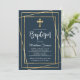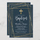 Gold Cross Modern Script Navy Blue Boy Baptism Invitation