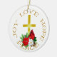 This is a pretty ornament which carries the true Christmas meaning within it. It features a gold cross with a beautiful Christmas bouquet at the foot. Poinsettia flowers, greenery, and a red cardinal brighten the bouquet. The image is encircled by the text Love Hope Peace Joy in gold. The back of the ornament has several text fields for you to customize, plus a pretty holly sprig divider. Makes a wonderful keepsake gift!