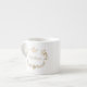 Elegant white espresso cup, with graphics of a gold tone flourish and crown text area with custom text. Personalize the text to this lovely addition to your dining table.