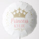 Princess theme birthday party balloon with custom-printed name and age text personalized in the gold crown with gold faux glitter and confetti background. Perfect for a little girl's royal fairy tale princess or queen theme birthday party gift or table decoration.