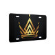 A black license plate with a golden crown in the center. The crown is stylized and geometric, with sharp angles and clean lines.