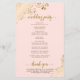 These wedding programs are elegant and tasteful, while still being budget friendly. The design features ornate golden faux foil curls and swirls with gold text on a pale blush pink background. The typography features lacy script calligraphy, and there is room for details on the ceremony, the bridal party, and a short thank you.