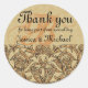A sophisticated and elegant way to seal your wedding favor bags or wedding cake boxes. A round seal with a gold damask pattern and Victorian swirl pattern. An ornate monogram is above that. Written over this lovely design is a thank you message and the bride and groom names. All of the text is customizable and editable. Change the message and the text font, color or size.