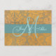 Gold Damask Save the Date Postcard | Blue with monogram initial.