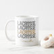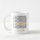 Bold letters spell out the word "LACROSSE" with the "O" replaced by a basket. The slightly distressed design makes a great personalized gift for a player, coach, team or fan. Available in red, orange, yellow, purple, green, blue, gray, black, forest green, navy, maroon, burnt orange, gold and powder blue. Matching products available.