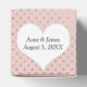 White heart with newlywed names on blush pink and glitter gold dot pattern.