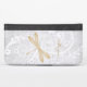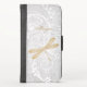 Protect your iPhone with this elegant Gold Dragonfly Personalized iPhone Wallet Case. Case design features a colorful dragonfly, a soft white floral vine against a light gray grunge damask background with an area to personalize with your name. Additional gift items available with this design as well as a variety of colors. Personalize for yourself or makes a great gift.