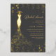 Cute bridal shower invitations with a gold and glitter backdrop and custom script with real foil glitter and an elegant bridal dress. Choose between two background colors and matching items.