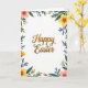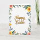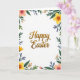 Designed with a calm spring look, this Easter card centers on the words “Happy Easter” in shimmering gold lettering across a bright white background. The text sits prominently in the middle, with a gentle sparkle effect that looks lightly speckled rather than flat. Around it, flowers and foliage curl in from all four corners, guiding your eyes inward like a soft embrace 🌷. Peach blossoms mingle with sunny yellow blooms that have warm orange centers, while leafy greens fill out the frame with a fresh, just-picked feel. Muted blue‑purple leaves and small clusters of orange berries add depth, like little details you’d notice when lingering close beside someone 🐰. The overall layout leaves plenty of open white space so the gold message feels airy and easy to read. The border forms a loose rectangle of botanicals, with the densest bunches tucked into each corner and lighter sprigs trailing toward the center.