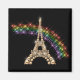 Gold pearly Eiffel Tower with rainbow on black.