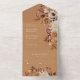 Gold | Fall Leaves Wedding All in One Invitation. This elegant all-in-one wedding invitation features hand-painted watercolor burnt orange, copper, and terracotta leaves, cream and beige dahlias, and beautiful rust-colored roses on a gold background. RSVP is included with this stylish invite. Find matching items in the Gold Autumn Romance Collection.