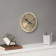A fancy and faux gold colored wall clock with faux wire detailing and faux 3d effect numbers. All very faux and fabulous. All a visual effect and not real gold (or metallic or wire or spokes)