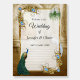 Two imperial Peacocks with slender necks ending in long extravagant decorative tail of impressive feathers curled around fragrant white Frangipani flowers on a chic Temple background design for the wedding couple wedding board