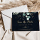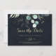 This gold floral calligraphy blue horizontal wedding save the date is perfect for a rustic wedding. This artistic design features hand-drawn gold floral and watercolor eucalyptus green foliage in a dark blue background, inspiring natural beauty.