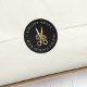 Label your correspondence or products with these chic stickers that match our Floral Scissors logo branding suite for hairstylists and salons. Rich black stickers feature a faux gold foil scissors illustration in the center, with two text fields curving around the outside, in classic white lettering.