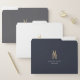 Chic file folder set features one white, one medium grey, and one navy blue folder, each with a faux gold foil scissors illustration on the front, and two lines of custom text beneath. Folders open to reveal a matching pattern of faux gold scissors embellished with tiny flowers. Perfect for your hair salon or hairstyling business.