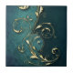 Elegant and intricate shadowed gold scrollwork on a background of teal blue damask in a dark to light gradient.