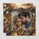 Romantic wedding Save the Date cards. Steampunk themed with gold metal gears, flowers and a gold bokeh background. Upload your favorite picture in the personalize area and edit the text on the back to add your own wedding info.